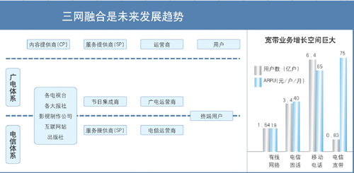 蘇少林:三網(wǎng)融合的推進對于我國在“后危機時代”拉動國內(nèi)消費、形成新的經(jīng)濟增長點有著積極的意義。據(jù)測算,三網(wǎng)融合可帶動6000億元~7000億元的投資和消費,還可增加20萬個就業(yè)崗位,由此推動的固網(wǎng)寬帶業(yè)務將拉動GDP增長0.8個百分點。因此,電信監(jiān)管部門要站在大力推動信息產(chǎn)業(yè)和文化產(chǎn)業(yè)發(fā)展、提高國民經(jīng)濟和社會信息化水平、滿足人民群眾日益多樣的生產(chǎn)和生活服務需求的高度上來推進三網(wǎng)融合。