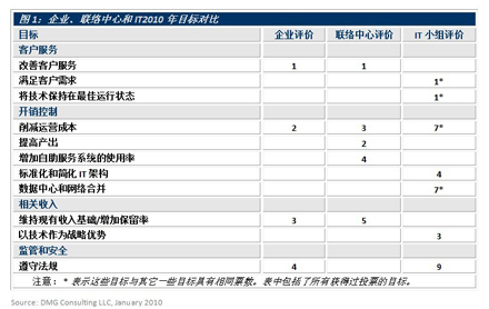 DMG的基準(zhǔn)調(diào)研顯示IT有自己的優(yōu)先級(jí):IT2010年的首要目標(biāo)是滿足商業(yè)客戶的需求并使企業(yè)的技術(shù)和應(yīng)用軟件運(yùn)行在最佳狀態(tài)。這表明IT企業(yè)是帶著強(qiáng)烈的支持企業(yè)客戶目標(biāo)和目的的意愿步入2010年的。但令人失望的是IT企業(yè)并沒(méi)有努力去了解他們客戶的目標(biāo)。這種目標(biāo)上的不一致是導(dǎo)致IT和聯(lián)絡(luò)中心之間缺乏信任的主要原因。