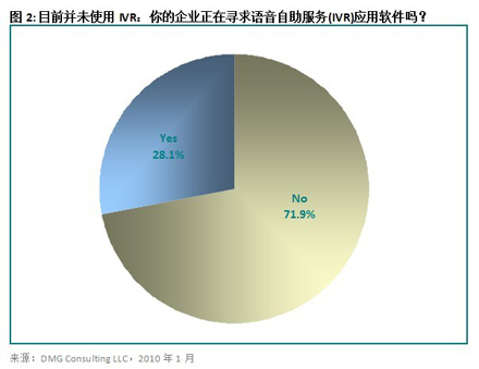 28.1%目前還沒(méi)有使用IVR系統(tǒng)的公司正在積極尋求語(yǔ)音自助服務(wù)解決方案來(lái)幫助自己達(dá)成目標(biāo),這一數(shù)字高得頗讓人驚訝。見(jiàn)圖2。經(jīng)濟(jì)衰退促使那些曾經(jīng)對(duì)使用自助服務(wù)技術(shù)猶豫不決的企業(yè)下定決心投資購(gòu)買此類解決方案。一個(gè)具有正確規(guī)劃、設(shè)計(jì)和投放過(guò)程的IVR系統(tǒng)能夠?qū)⑷斯ご硖幚淼碾娫捔拷档?0%到90% (長(zhǎng)期來(lái)說(shuō)),具體數(shù)字有賴于聯(lián)絡(luò)中心的目的以及編入解決方案內(nèi)部的任務(wù)。IVR用戶的增長(zhǎng)勢(shì)頭有望在經(jīng)濟(jì)形勢(shì)好轉(zhuǎn)之后仍然延續(xù)下去。一個(gè)經(jīng)過(guò)良好設(shè)計(jì)并成功實(shí)施的IVR方案所帶來(lái)的利益和節(jié)約的成本是即便最不情愿使用它的經(jīng)理都不得不承認(rèn)的。