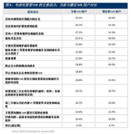 圖3顯示了現(xiàn)有和潛在的語(yǔ)音自助服務(wù)用戶尋求托管型IVR的主要?jiǎng)恿?lái)源。潛在客戶認(rèn)真考慮托管型IVR解決方案的兩個(gè)很明顯的原因是避免大的資金開(kāi)銷和最小化啟動(dòng)成本,在經(jīng)濟(jì)不景氣時(shí)這樣的做法并不令人意外。另外還有個(gè)原因是希望一邊使用該方案一邊積累經(jīng)驗(yàn)和知識(shí)。