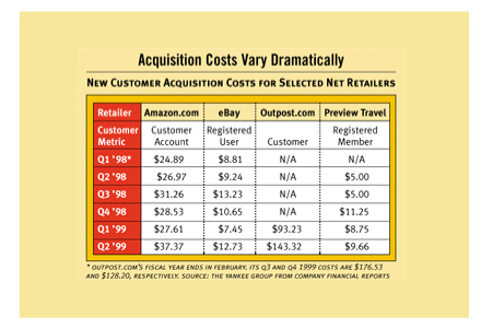 上世紀(jì)90年代末期DOT.COM就遭遇了這一嚴(yán)峻問題。70% - 80%的客戶在沒有完成采購(gòu)之前就棄網(wǎng)站而去。對(duì)于許多人來(lái)說(shuō)這被認(rèn)為是一個(gè)“行業(yè)基準(zhǔn)”,屬于可接受水平,但也有些人開始尋找解決方案。整個(gè)行業(yè)開始注意到分析家們的忠告:這一水平的放棄率是不被允許的。下面這張由Yankee集團(tuán)在2000年發(fā)布的表格向我們展示了電子商務(wù)企業(yè)客戶獲取成本螺旋形盤升的過(guò)程。