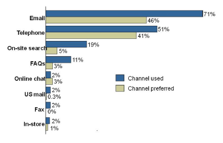 正是基于這一點(diǎn)供應(yīng)商們紛紛加入PeopleSupport的陣營(yíng),并且在這之后不久統(tǒng)一的排隊(duì)技術(shù)就問世了,更在之后發(fā)展成全面集成的聯(lián)絡(luò)中心解決方案和eCRM套件。這些系統(tǒng)允許聯(lián)絡(luò)中心將電話流與交談、電子郵件、郵寄信件和傳真混合起來(lái),現(xiàn)在,SMS也來(lái)了。Forrester調(diào)研機(jī)構(gòu)2005年進(jìn)行了一個(gè)調(diào)研,意在檢測(cè)客戶偏愛的聯(lián)絡(luò)渠道有哪些以及他們實(shí)際使用的渠道又是哪些。該調(diào)研貫穿全美所有類型的企業(yè)(并不局限于電子零售商或DOT.COM們)