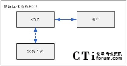對(duì)于客服中心來(lái)講,當(dāng)受理了用戶的需求時(shí),CSR與用戶便成了服務(wù)流程中的關(guān)鍵角色,安裝人員只是CSR的一個(gè)協(xié)作角色(內(nèi)部流程下游角色)。如果在為用戶提供服務(wù)過(guò)程中,將安裝人員“引入”流程中,無(wú)疑將影響流程的執(zhí)行效果。另外,讓用戶代替CSR去聯(lián)系“安裝人員”這更加影響用戶的感受。