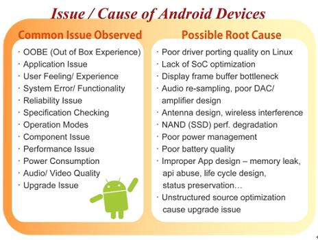 盡管Android系統(tǒng)的普及看似指日可待,但在實際的產(chǎn)品應(yīng)用上,也有其可能產(chǎn)生的問題風(fēng)險。Android作為一個開放式的操作系統(tǒng),是Google提供廠商的操作系統(tǒng)參考架構(gòu)(reference design),廠商能有充足的發(fā)揮空間,以Android為基礎(chǔ)向上開發(fā)設(shè)計自家產(chǎn)品,但也因為這樣的開放性與自由性,讓廠商在軟硬件結(jié)合的這個環(huán)節(jié)必須下更大的功夫,像是如何挑選合適的硬件包括基頻處理器、通信芯片、觸控感應(yīng)芯片、天線與存儲器模組等,以及如何調(diào)整出最適當(dāng)?shù)能浖O(shè)定等,更重要的是如何將軟硬件整合,開發(fā)出差異化的產(chǎn)品。這中間所有的細(xì)節(jié)都會對產(chǎn)品最終樣貌產(chǎn)生莫大的影響,像是其功能的完整度、使用接口的設(shè)計、效能表現(xiàn)(例如觸控滑動畫面、開啟程序所需時間)、品質(zhì)可靠度、甚至是后續(xù)的固件升級動作等等。在此百佳泰便試圖以專業(yè)中立的測試實驗室角度,來點出廠商應(yīng)用Android于手機、平板電腦或其他設(shè)備時應(yīng)注意的開發(fā)重點,以希冀作為一個有效的參考資訊。