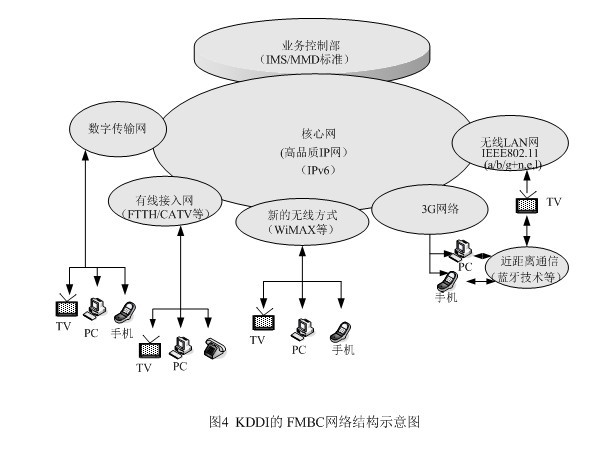 為了在市場競爭中立于不敗之地,KDDI另辟稀徑,提出了將固定網(wǎng)、移動網(wǎng)、因特網(wǎng)和電視廣播相融合的概念,它與朝日新聞、朝日電視簽署合作框架,就是它的集中代表。FMBC是超3G的構(gòu)想,是以移動通信為基礎(chǔ),與固定電話網(wǎng)及因特網(wǎng)進(jìn)行融合,現(xiàn)在又把廣播電視納入,這樣它就成了KDDI的NGN了。FMBC的網(wǎng)絡(luò)結(jié)構(gòu)請見圖4。從圖4上不難發(fā)現(xiàn)NGN的影子,特別是業(yè)務(wù)控制部的設(shè)立,并采用ISM/MMD標(biāo)準(zhǔn),將網(wǎng)絡(luò)與應(yīng)用分開,以利新業(yè)務(wù)的開拓,同時完成核心網(wǎng)的IP化,這些都是NGN的基本概念。