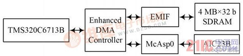 由于系統(tǒng)運(yùn)行過(guò)程中需要實(shí)現(xiàn)的算法較多,僅依靠TMS320C6713B 的192 KB片內(nèi)RAM 來(lái)執(zhí)行程序是很困難的。本文使用了EMIF 的接口擴(kuò)展了SDRAM 作為算法和數(shù)據(jù)的存儲(chǔ)區(qū)域。采用TLV320AIC23B 實(shí)現(xiàn)音頻輸入和輸出,AIC23 支持48 kHz 帶寬、96 kHz 采樣率的雙聲道立體聲A/ D,D/ A,音頻輸入包括了*輸入和線路輸入。