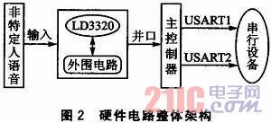 如圖2所示,硬件電路主要包括主控核心部分和語音識(shí)別部分。語音進(jìn)入語音識(shí)別部分后,將處理過的數(shù)據(jù)并行傳輸?shù)街骺刂破,主控制器?jīng)過處理后,發(fā)送命令數(shù)據(jù)到USART,USART可用于擴(kuò)展外圍串行設(shè)備,如語音合成模塊等。