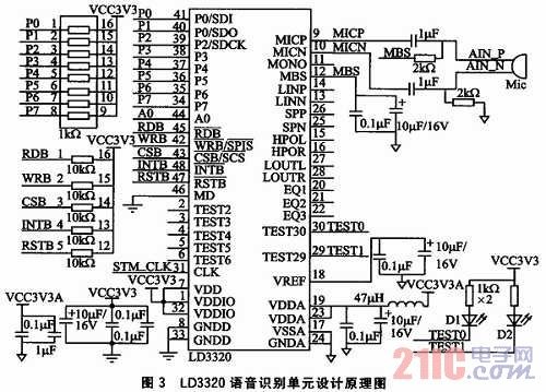 圖3為語音識(shí)別部分原理圖,參照了ICRoute發(fā)布的LD3320數(shù)據(jù)手冊(cè)進(jìn)行設(shè)計(jì)。LD3320的內(nèi)部集成了快速穩(wěn)定的優(yōu)化算法,不需外接Fla-sh、RAM,不需要用戶事先訓(xùn)練和錄音而完成非特定人語音識(shí)別,識(shí)別準(zhǔn)確率高。