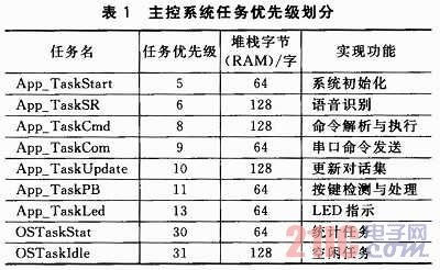 表1中除OSTaskStat和OSTaskIdle任務(wù)為系統(tǒng)自帶,其他7個(gè)任務(wù)均為用戶創(chuàng)建。App_TaskStart是系統(tǒng)的第一個(gè)任務(wù),對(duì)系統(tǒng)時(shí)鐘和底層設(shè)備進(jìn)行初始化,創(chuàng)建所有事件和其他各項(xiàng)用戶任務(wù),并對(duì)系統(tǒng)狀態(tài)進(jìn)行監(jiān)測(cè);App_TaskSR完成語音識(shí)別;App_TaskCmd完成對(duì)話集中命令的解析和執(zhí)行,并通過USART1向外發(fā)送;App_TaskCom作為外圍擴(kuò)展任務(wù),通過USART2向外發(fā)送指令或數(shù)據(jù),負(fù)責(zé)控制外圍擴(kuò)展設(shè)備,如語音合成設(shè)備等;
