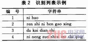 、趯懭胱R(shí)別列表。列表的規(guī)則是,每個(gè)識(shí)別條目對(duì)應(yīng)一個(gè)特定的編號(hào)(1個(gè)字節(jié)),編號(hào)可以相同,可以不連續(xù),但是數(shù)值要小于256(00H~FFH)。本芯片最多支持50個(gè)識(shí)別條目,每個(gè)識(shí)別條目是標(biāo)準(zhǔn)普通話的漢語拼音(小寫),每2個(gè)字(漢語拼音)之間用一個(gè)空格間隔。本文中采取了連續(xù)不同編號(hào)的識(shí)別條目,表2是簡(jiǎn)單的示例。