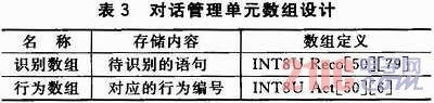 為了方便進(jìn)行對(duì)話的管理,本文中設(shè)計(jì)了一個(gè)對(duì)話管理單元,用于對(duì)等待識(shí)別的語句和等待執(zhí)行的命令進(jìn)行存儲(chǔ),在主控制器中通過定義二維數(shù)組來實(shí)現(xiàn)。LD3320每次識(shí)別最多可以設(shè)置50項(xiàng)候選識(shí)別句,每個(gè)識(shí)別句可以是單字、詞組或短句,長(zhǎng)度為不超過10個(gè)漢字或者79個(gè)字節(jié)的拼音串;谏鲜鲈颍疚脑O(shè)計(jì)的對(duì)話管理數(shù)組如表3所列。