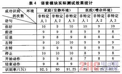為了保證設(shè)計(jì)的語音識(shí)別模塊的語音識(shí)別率、穩(wěn)定性和響應(yīng)時(shí)間,本文對(duì)所描述的語音識(shí)別模塊做了相應(yīng)的測(cè)試,測(cè)試環(huán)境分別為安靜的家庭環(huán)境和嘈雜的醫(yī)院環(huán)境,共8條語音指令,對(duì)每條語音指令分別進(jìn)行10次測(cè)試,每個(gè)環(huán)境下對(duì)每個(gè)特定人的總實(shí)驗(yàn)次數(shù)為80次,記錄成功識(shí)別的次數(shù)。測(cè)試結(jié)果如表4所列。