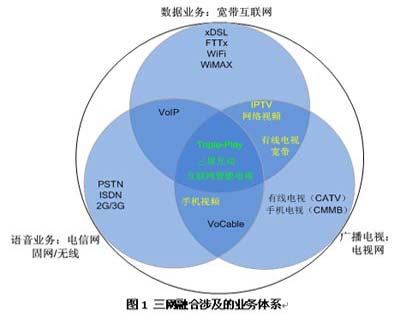 這種沖擊表現(xiàn)在信息通信領(lǐng)域的“時(shí)移事易”上,一個(gè)是在時(shí)間維度上,一個(gè)是在影響產(chǎn)業(yè)發(fā)展重大事件的維度上。其長(zhǎng)期累積的結(jié)果是,當(dāng)前全球范圍內(nèi)影響最大、最深遠(yuǎn)的莫過(guò)于寬帶網(wǎng)絡(luò)成為國(guó)家的信息化基礎(chǔ)設(shè)施。寬帶的普及深刻的影響和推動(dòng)了以TCP/IP為技術(shù)基礎(chǔ)的“三重播放”和在市場(chǎng)競(jìng)爭(zhēng)層面的“多重捆綁”業(yè)務(wù)營(yíng)銷策略,這構(gòu)成了三網(wǎng)融合最基本的內(nèi)容,隨之帶動(dòng)了近年已成為業(yè)界關(guān)注焦點(diǎn)的視頻業(yè)務(wù)向“一云三網(wǎng)多屏”的方向發(fā)展?傊录夹g(shù)和新產(chǎn)業(yè)發(fā)展導(dǎo)致傳統(tǒng)的電信業(yè)和廣播電視業(yè)從封閉逐步走向開(kāi)放,渠道、內(nèi)容、消費(fèi)者偏好均從單一走向多元;對(duì)消費(fèi)者而言,信息的流動(dòng)從單向變?yōu)殡p向和多向,新媒體、全媒體、自媒體在社會(huì)上的份量快速上升。 而來(lái)自市場(chǎng)的需求變化是:過(guò)去那種內(nèi)容和服務(wù)緊密捆綁于網(wǎng)絡(luò)的業(yè)務(wù)模式被開(kāi)放的互聯(lián)網(wǎng)沖擊得疲于招架,網(wǎng)絡(luò)和渠道的地位不斷下降,處于底層的網(wǎng)絡(luò)整合開(kāi)始朝著契合于上層內(nèi)容和應(yīng)用整合的方向發(fā)展;內(nèi)容和應(yīng)用成為產(chǎn)業(yè)發(fā)展的新重心,傳統(tǒng)運(yùn)營(yíng)商在挖潛增效做好“智能管道”的同時(shí),也希望借助三網(wǎng)融合躋身綜合信息服務(wù)領(lǐng)域。表現(xiàn)在網(wǎng)絡(luò)層面,傳統(tǒng)的電信業(yè)務(wù)大范圍地向?qū)拵P網(wǎng)上遷移;傳統(tǒng)的有線電視網(wǎng)進(jìn)軍新媒體,“電信化”色彩越來(lái)越強(qiáng)。在業(yè)務(wù)層面,如下圖示所,典型的融合業(yè)務(wù)如有線寬帶、IPTV、VoIP、手機(jī)視頻、互聯(lián)網(wǎng)智能電視等成為雙方競(jìng)爭(zhēng)的主陣地。