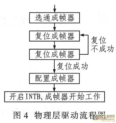 物理層通過地址總線映射配置成幀器,其中PCI橋設(shè)備和成幀器之間經(jīng)過CPLD控制選通。物理層驅(qū)動完成配置成幀器、復位控制等。成幀器是將E1上的比特流整合成符合規(guī)范的HDLC幀,其中一個標準HDLC幀包括32個時隙,這些時隙可配置映射到HDLC控制器的端口信道,實現(xiàn)2 M、N×64 K、N×8 K高速模式。其配置流程如圖4所示。