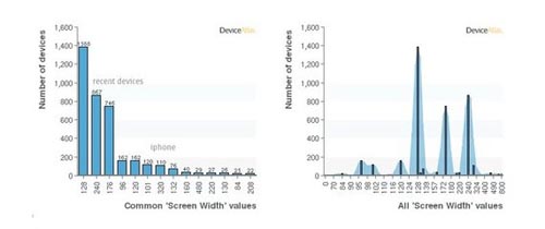 還有一點(diǎn),不到5%的設(shè)備寬度大于320個(gè)像素。但這一數(shù)字可能會在未來有所提升,目前已經(jīng)可以看到,小屏幕(128,176等)設(shè)備正逐漸被大屏幕(240+)設(shè)備所代替。下面的圖表給出了相關(guān)的分析。