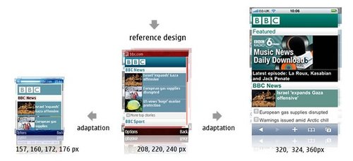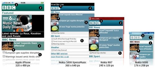 BBC還可以為特定的設(shè)備(或是一組設(shè)備)重新編排一些內(nèi)容。iPhone有非常豐富的功能,因此iPhone版的BBC還有音樂下載選項(xiàng),而其他的設(shè)備可能只會顯示今天最熱門的‘BBC新聞’?梢愿鶕(jù)數(shù)據(jù)的大小,多媒體的處理能力甚至是屏幕的尺寸決定是否需要針對iPhone提供更加豐富的內(nèi)容。以Nokia 6680上的‘特色’顯示為例,它大部分的顯示內(nèi)容是讓用戶滾動屏幕查看今天最熱門新聞故事。iPhone上顯示了三個(gè)新聞故事,而其中只有一篇配有插入。這使得用戶無需滾動屏幕就可以大致了解全部的咨詢。