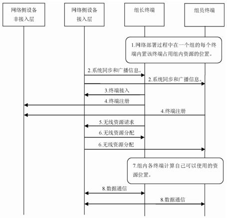 (6)網(wǎng)絡側(cè)設備接入層向組長終端發(fā)布分配給該終端組的無線資源。