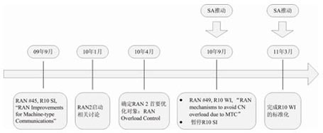 在2010年9月的RAN #49次全會上,在SA的推動下,RAN全會決定成立一個關(guān)于MTC的新的WI,用來解決避免大量MTC設備接入導致的核心網(wǎng)過載問題。2011年3月份,RAN2完成了此WI并在RAN全會上通過。圖4所示的是3GPP MTC R10標準化項目進程情況。