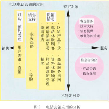 ——圖2表示以電話營銷的目的及對象為軸分析電話營銷的應用。縱軸為對象,分為“特定”和“不特定”,橫軸為目的,分為“服務”和“銷售”。這樣右上區(qū)域=“特定對象X服務”,即為客戶服務,右下區(qū)域=“不特定對象X服務”,對應信息咨詢;左側為銷售。從對象來看,服務更偏重于“特定對象”。從目的來看,訂購/預約受理是最直接的銷售行為,所以放在最左,銷售支持在中間,促銷活動靠右。