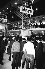 韓國移動通信運營商SK電訊的展臺是整個展會上最熱鬧的地方之一,能歌善舞的韓國藝人吸引了很多觀眾駐足。在“為人類的移動互聯(lián)通信, SK電訊與您攜手”的主題下,SK電訊展示了移動增值及移動互聯(lián)服務。