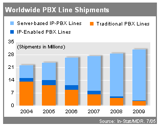 據(jù)In-Stat報告說,隨著IP線路出貨量今年有望超過傳統(tǒng)PBX,IP PBX進入了一個新的成熟階段。雖然整個PBX市場預(yù)計將以6.6%的復(fù)合年增長率增長至2009年,但傳統(tǒng)PBX正在迅速下滑,IP PBX勢頭越來越強。