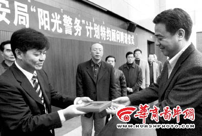 昨日下午2時(shí)許,重慶市公安局“陽光警務(wù)”特約顧問聘請(qǐng)儀式上,重慶市公安局副局長(zhǎng)、政治部主任彭長(zhǎng)健頒發(fā)了特約顧問聘書。重慶市社會(huì)科學(xué)院研究員孫元明等18人成為我市警方首批聘請(qǐng)的“陽光警務(wù)”特約顧問。他們將作為警方的“智囊團(tuán)”直接參與、監(jiān)督警務(wù)活動(dòng),聘任時(shí)間為兩年。