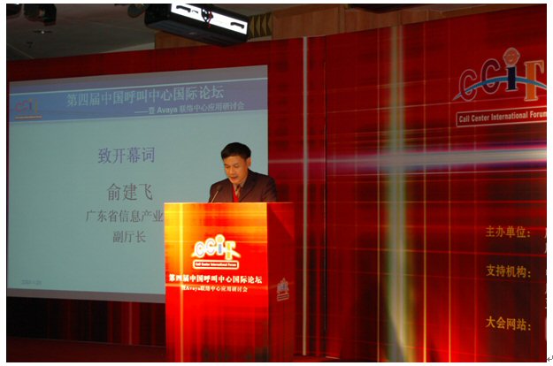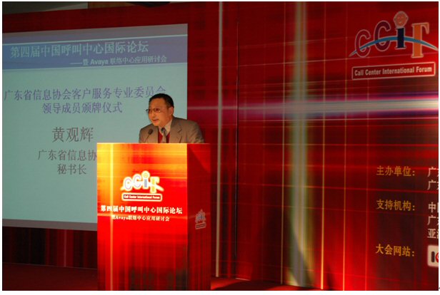 由廣東省信息協(xié)會(huì)、廣東省電子商務(wù)協(xié)會(huì)聯(lián)合主辦,廣東省信息協(xié)會(huì)客戶服務(wù)專業(yè)委員會(huì)、廣州市品派文化傳播有限公司策劃承辦,AVAYA公司總協(xié)辦的第四屆中國(guó)呼叫中心國(guó)際論壇于2007年1月23日在廣州亞洲國(guó)際大酒店隆重舉行,廣東省信息產(chǎn)業(yè)廳副廳長(zhǎng)俞建飛出席會(huì)議并致開幕詞。會(huì)上,廣東省信息協(xié)會(huì)秘書長(zhǎng)黃觀輝、AVAYA公司銷售總經(jīng)理?xiàng)畛、民生銀行電子銀行部華南運(yùn)營(yíng)中心總經(jīng)理李濤、網(wǎng)易客戶服務(wù)部總監(jiān)張?jiān)频确謩e做了主題發(fā)言。來(lái)自全國(guó)各地300多位企業(yè)管理人員參加了本次論壇。