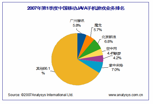 從企業(yè)實(shí)力和市場(chǎng)份額來看,目前手機(jī)游戲市場(chǎng)主要有三股力量組成,以空中等為代表的全業(yè)務(wù)線電信增值服務(wù)商(SP),以新浪等為代表的互聯(lián)網(wǎng)門戶綜合服務(wù)商,以米格、魔龍為代表的專業(yè)手機(jī)游戲產(chǎn)品與服務(wù)提供商(SP)。根據(jù)中國移動(dòng)“百寶箱”第1季度收入數(shù)據(jù),易觀注意到,掌中米格、北京新浪、廣州摩訊位列前三,前三名占據(jù)了近20%的市場(chǎng)份額。夢(mèng)網(wǎng)手機(jī)游戲精品業(yè)務(wù)的三家服務(wù)提供商第一季度收入排名為:米格、新浪、空中網(wǎng)!