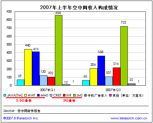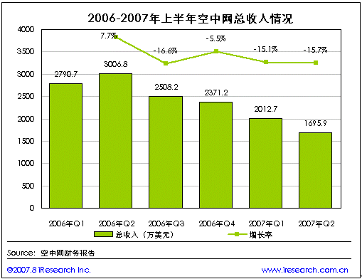 空中網2007年第二季度財報數(shù)據(jù)顯示,第二季度空中網的總收入1695.9萬美元,同比負增長43.6%,環(huán)比負增長15.7%。與第一季度相比在空中網兩個產品平臺的主要2G業(yè)務和2.5G的業(yè)務收入都出現(xiàn)了不同程度的下降,但2G業(yè)務中的IVR業(yè)務收入則出現(xiàn)了大幅上升。