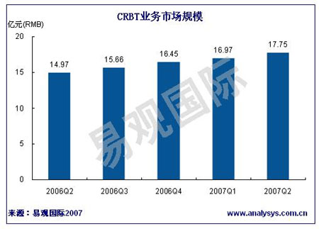 易觀國際研究表明,2007年第2季度中國彩鈴業(yè)務(wù)市場規(guī)模達(dá)到17.75億人民幣,同比增長18.54%。其中對無線音樂平臺的持續(xù)投入和推廣使中國移動彩鈴業(yè)務(wù)穩(wěn)步增長,其彩鈴市場規(guī)模為13.27億人民幣,同比增長19.77%。中國聯(lián)通彩鈴市場規(guī)模為4.48億元,同比上升15.17%。