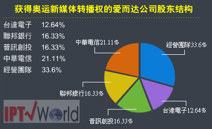 據(jù)IPTVWorld了解,2008年第29屆北京奧運(yùn)比賽轉(zhuǎn)播權(quán)臺灣區(qū)網(wǎng)絡(luò)與手機(jī)平臺轉(zhuǎn)播權(quán)。國際奧委會 (IOC)除了證實(shí)這項(xiàng)消息,也表示,經(jīng)過度。另外,鑒于愛爾達(dá)在美國職棒等運(yùn)動賽事和韓劇等數(shù)字內(nèi)容版權(quán)經(jīng)營與后制服務(wù)擁有豐富的實(shí)務(wù)經(jīng)驗(yàn),中華電在今年4月進(jìn)一步以溢價(jià)參與愛爾達(dá)增資,取得21%的股權(quán),成為愛爾達(dá)除了經(jīng)營團(tuán)隊(duì)外最大的股東。