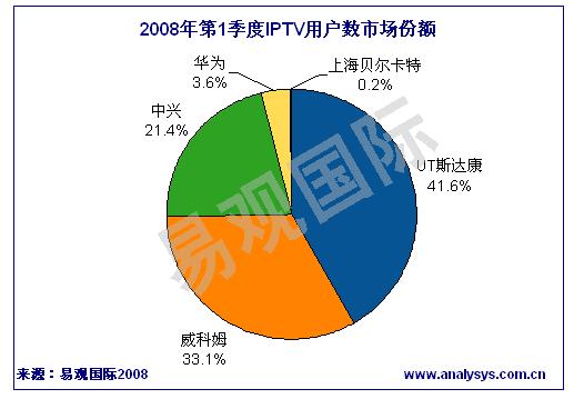《2008年第1季度中國IPTV市場季度監(jiān)測》數(shù)據(jù)顯示,2008年第1季度中國IPTV累計用戶數(shù)達(dá)131萬人。根據(jù)各廠商中標(biāo)業(yè)務(wù)區(qū)實際發(fā)展的用戶數(shù)排名,UT斯達(dá)康、威科姆、中興通訊位居前三。2008年第1季度IPTV廠商的競爭格局沒有顯著變化。
