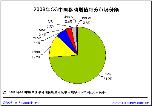 根據(jù)iResearch艾瑞咨詢最新出版的《2008年第三季度中國(guó)移動(dòng)增值行業(yè)發(fā)展報(bào)告》數(shù)據(jù)顯示,2008年第三季度中國(guó)移動(dòng)增值服務(wù)市場(chǎng)規(guī)模達(dá)332.4億元,同比增長(zhǎng)40.2%.其中短信市場(chǎng)規(guī)模以74.0%的比例位居第一,CRBT和WAP分別以12.9%和6.2%的份額居第二、第三。