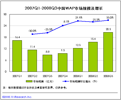 艾瑞咨詢研究發(fā)現(xiàn),2008年第三季度,WAP總體市場(chǎng)規(guī)模為20.5億,環(huán)比增長(zhǎng)33.0%.其中,中國(guó)移動(dòng)官方WAP市場(chǎng)規(guī)模為18.6億,環(huán)比增長(zhǎng)27.1%,中國(guó)聯(lián)通官方WAP市場(chǎng)規(guī)模為1.88億,環(huán)比增長(zhǎng)24.8%。