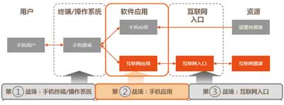 在楊俊看來,應(yīng)用商店的到來改變了傳統(tǒng)模式。例如,開放的互聯(lián)網(wǎng)模式推倒了原來的花園圍墻,手機(jī)軟件類型從單機(jī)應(yīng)用走向在線應(yīng)用,手機(jī)軟件來源從內(nèi)置型轉(zhuǎn)向用戶自主下載、自定制和自安裝。最重要的是,各大廠商不僅滿足于應(yīng)用商店這一畝三分地,而是把觸角延伸到了產(chǎn)業(yè)鏈上的各個環(huán)節(jié),由此形成了三個主要戰(zhàn)場:手機(jī)終端及操作系統(tǒng)、手機(jī)應(yīng)用、互聯(lián)網(wǎng)入口,具體見圖所示。