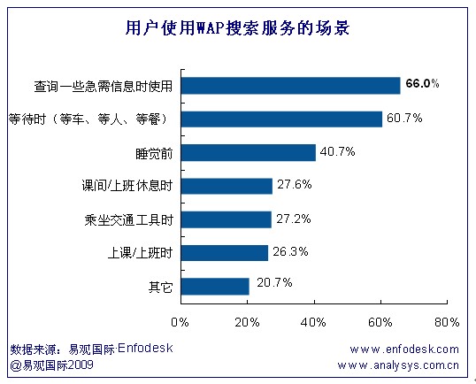 根據(jù)易觀Enfodesk《中國(guó)移動(dòng)搜索市場(chǎng)用戶調(diào)研報(bào)告2009》研究發(fā)現(xiàn),用戶使用WAP搜索服務(wù),一般情況是在查詢一些急需信息和等待時(shí)(等車(chē)、等人、等餐),這兩類(lèi)情形的使用比例均在60%以上。值得注意的是,在睡覺(jué)前,用戶使用移動(dòng)搜索服務(wù)的比例達(dá)40.7%。而在其他休閑時(shí)間,如課間/上班休息時(shí)、乘坐交通工具、上課/上班時(shí)也是用戶經(jīng)常使用WAP搜索服務(wù)的場(chǎng)景。