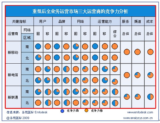盡管產業(yè)鏈完備程度相差較為明顯,但運營商各自業(yè)務與用戶服務運營能力對3G時常的發(fā)展影響也至關重要,根據(jù)易觀國際Enfodesk發(fā)布的《國內運營商3G業(yè)務發(fā)展策略研究系列—中國3G市場現(xiàn)狀與發(fā)展策略概述》報告顯示,在發(fā)展3G的過程中,三大運營商各自有一定的優(yōu)劣勢: