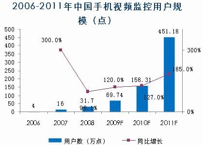 諾達咨詢預測,2006年中國手機監(jiān)控用戶以4萬點計算,2009年隨著運營商3G網絡建設和3G業(yè)務的推進,用戶數將有大幅度增長,2010年用戶將達到158.31萬點,2011年達到451.18萬點。