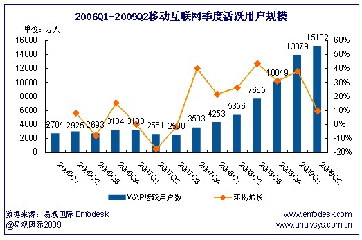 2009年第2季度中國(guó)移動(dòng)互聯(lián)網(wǎng)活躍用戶(hù)規(guī)模達(dá)1.52億