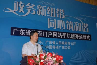 2009年8月7日,廣東省政府在廣州舉行省政府門戶網(wǎng)站手機版開通儀式。省政府秘書長徐尚武、中國移動廣東公司總經(jīng)理徐龍在開通儀式上致辭。