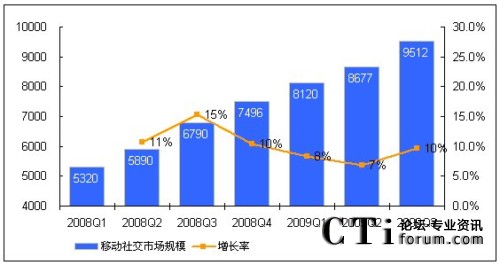 CTI論壇(ctiforum)12月8日消息(記者 楊?lèi)偅?馳昂咨詢(Sinotes)發(fā)布的《2009年中國(guó)移動(dòng)互聯(lián)網(wǎng)業(yè)務(wù)市場(chǎng)監(jiān)測(cè)-第三季度》報(bào)告數(shù)據(jù)顯示,2009年Q3中國(guó)移動(dòng)社交業(yè)務(wù)市場(chǎng)規(guī)模才超過(guò)9000萬(wàn)元,達(dá)9512萬(wàn)元,直逼億元大關(guān)。與2009年Q2相比,增長(zhǎng)率達(dá)10%。預(yù)計(jì)其年增長(zhǎng)率將超過(guò)30%。