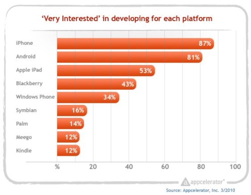 根據(jù)報道,在2010年1月,有86%的開發(fā)者非常有興趣開發(fā)iPhone應用程序,而68%的開發(fā)者非常有興趣開發(fā)Android程序,差距是18%。而在3月時,這個差距縮小到6%(iPhone 87%、Android 81%,iPad是53%)。