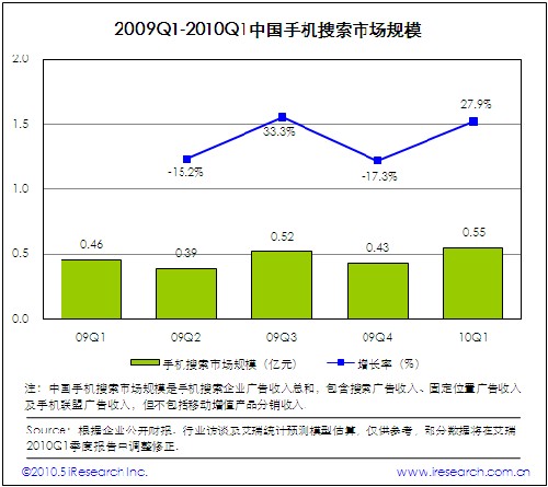 2010Q1中國手機搜索市場規(guī)模為5500萬,環(huán)比增長27.9%,手機搜索請求量和PV的大幅增長帶動廣告收入增加。自2009年下半年以來,受手機上網(wǎng)用戶規(guī)模迅速發(fā)展以及用戶活躍度和黏性顯著增加的影響,手機搜索市場進入快速發(fā)展階段。與此同時,手機搜索企業(yè)紛紛加大市場投入力度,建立與電信運營商和手機終端廠商的深度合作關(guān)系是業(yè)務拓展的重點方向。此外,網(wǎng)頁產(chǎn)品和客戶端軟件深度整合也是手機搜索企業(yè)布局移動互聯(lián)網(wǎng)市場的最佳實踐。受谷歌事件影響,艾瑞預計2010Q2手機搜索市場集中度將進一步提高。