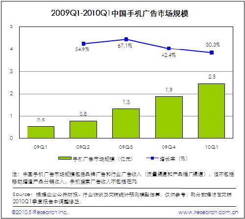 2010Q1中國手機廣告市場規(guī)模達到2.5億,環(huán)比增長30.3%.受季節(jié)性因素影響,手機廣告市場增速放緩,但是保持增長發(fā)展態(tài)勢。本季度,新聞、體育、數(shù)碼、女性和汽車類手機廣告市場表現(xiàn)良好,文本、橫幅、全屏以及客戶端軟件等手機廣告形式受到廣告主青睞。針對不同受眾群體進行多重定向廣告營銷成為更多手機廣告服務提供商的實踐方向。盡管本季度手機廣告市場取得良好的市場表現(xiàn)力,但是廣告定價和廣告效果評估等制約手機廣告市場發(fā)展的關(guān)鍵因素仍將長期存在。