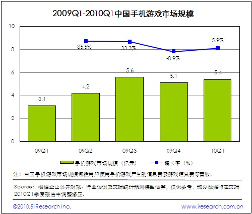 2010Q1中國手機游戲市場規(guī)模為5.4億,環(huán)比增長5.9%.2009年底電信運營商調(diào)整業(yè)務合作伙伴計費政策,導致WAP和G+手機游戲平臺等特定計費平臺暫時停止計費,對手機游戲市場營收增長產(chǎn)生不利影響。除了季節(jié)因素以外,手機單機游戲受電信運營商暫停WAP計費影響較大,手機網(wǎng)游受政策影響有限。盡管本季度手機游戲市場扭轉(zhuǎn)營收規(guī)模下滑的不利局面,重新恢復增長態(tài)勢,但是手機游戲?qū)﹄娦胚\營商計費通道的高依存度,決定行業(yè)受政策風險的影響較大。實現(xiàn)營收多元化是手機游戲業(yè)界思考和關(guān)注的問題。