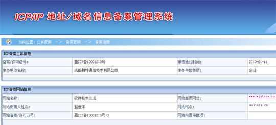 從目前看,WoStore相關(guān)域名可能同樣無法幸免,盡管目前wostore.cn已被用作中國(guó)聯(lián)通“WoStore應(yīng)用商店”官網(wǎng)域名,并在版權(quán)區(qū)標(biāo)注為“中國(guó)聯(lián)通版權(quán)所有”,但目前域名注冊(cè)商處信息仍然顯示,wostore.cn所有者為“成都融特通信技術(shù)有限公司”。工信部備案資料顯示, wostore.cn于今年1月11日通過審核備案,目前網(wǎng)站負(fù)責(zé)人同樣是成都融特通信技術(shù)有限公司。