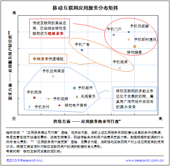 根據(jù)艾瑞咨詢近期發(fā)布的《2009-2010年中國移動(dòng)互聯(lián)網(wǎng)行業(yè)發(fā)展報(bào)告》,移動(dòng)互聯(lián)網(wǎng)各應(yīng)用服務(wù)在“應(yīng)用服務(wù)商業(yè)可行度”和“應(yīng)用服務(wù)用戶接受度”兩個(gè)維度上被劃分為“明星業(yè)務(wù)”、“中間業(yè)務(wù)”和“潛力業(yè)務(wù)”三個(gè)類型。具備一定規(guī);l(fā)展市場條件,但還面臨若干限制因素的移動(dòng)互聯(lián)網(wǎng)業(yè)務(wù),將在未來逐步打開市場。
