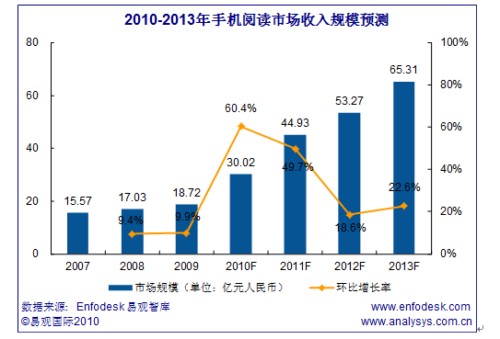 中國(guó)手機(jī)閱讀市場(chǎng)2010年在運(yùn)營(yíng)商閱讀基地的推動(dòng)下,收入規(guī)模相比2009年有快速的增長(zhǎng),增長(zhǎng)幅度達(dá)60.4%。預(yù)計(jì)2013年中國(guó)手機(jī)閱讀市場(chǎng)銷售規(guī)模將達(dá)到65.31億元,活躍用戶達(dá)到3.69億人。
