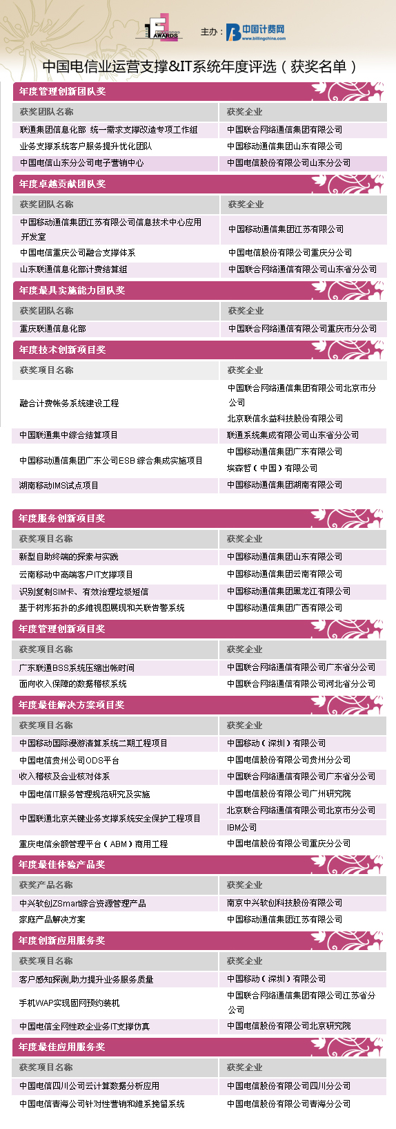 由中國(guó)計(jì)費(fèi)網(wǎng)(www.billingchina.com)主辦的“Awards2010”第四屆中國(guó)電信業(yè)運(yùn)營(yíng)支撐&IT系統(tǒng)年度評(píng)選活動(dòng)的結(jié)果于2011年元月31日隆重揭曉。自2010年12月1日評(píng)選活動(dòng)正式啟動(dòng)以來(lái),歷時(shí)兩個(gè)月,來(lái)自國(guó)內(nèi)運(yùn)營(yíng)商集團(tuán)、省級(jí)公司、IT產(chǎn)品與服務(wù)提供商的42家企業(yè)的優(yōu)秀產(chǎn)品、項(xiàng)目和團(tuán)隊(duì)共計(jì)70份參評(píng)項(xiàng)目入圍評(píng)選。經(jīng)過全面征集、選拔、初審以及評(píng)委團(tuán)的嚴(yán)格評(píng)審,評(píng)選結(jié)果已經(jīng)公示。在30位來(lái)自運(yùn)營(yíng)商IT支撐、業(yè)務(wù)和服務(wù)部門的威權(quán)評(píng)委們的認(rèn)真評(píng)審后,共有27家企業(yè)分別獲得了30個(gè)Awards2010的團(tuán)隊(duì)/項(xiàng)目/產(chǎn)品/應(yīng)用服務(wù)的榮譽(yù)桂冠。