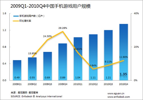 另外,從手機(jī)游戲用戶規(guī)模來看,2010年第4季度中國(guó)手機(jī)游戲用戶數(shù)量達(dá)到了1.35億,環(huán)比增長(zhǎng)11.9%。
